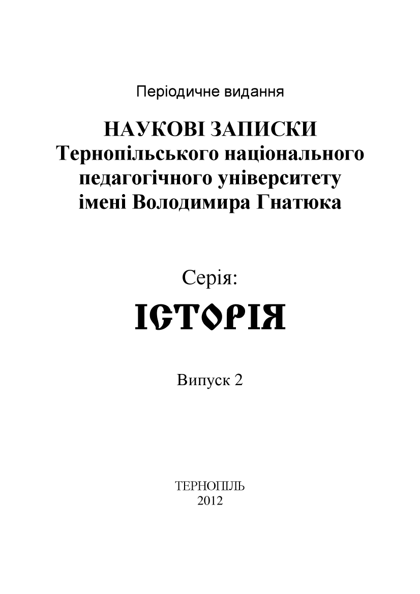 Н34          Наукові записки Тернопільського державного педагогічного університету ім. В. Гнатюка. Сер. Історія [Текст]. Вип. 2 / за заг. ред. І. С. Зуляка ; редкол.: М. Алексієвець, Л. Алексієвець, М. Бармак [та ін.]. – Тернопіль : ТНПУ, 2012. – 302 с. – 50.00.
