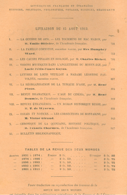 R48          Revue des Deux Mondes [Текст]. – 1913. – T. 16 (15 aout). – P. 722-958. – На тит. арк. кн. знак: Бібліотека Кременецького Державного Учительського Інституту.