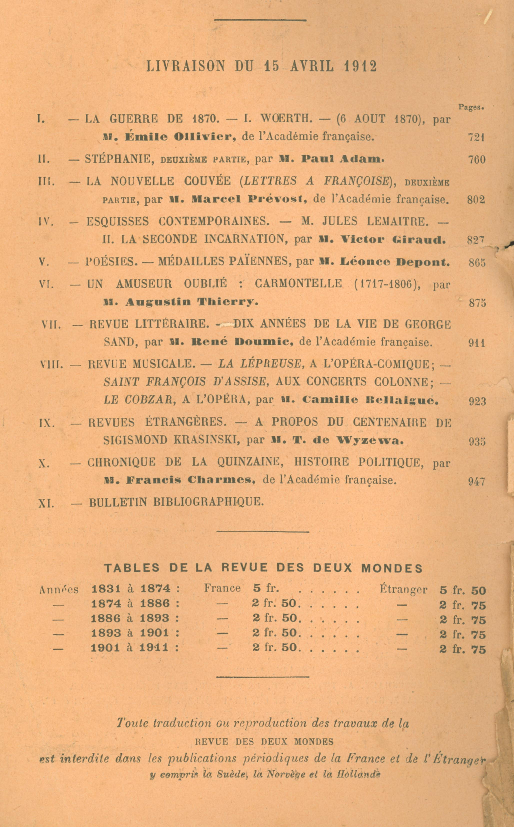 R48          Revue des Deux Mondes [Текст]. – 1912. – T. 8 (15 avril). – P. 722-958. – На тит. арк. кн. знак: Militaerwissenschaftlicher und Kasino Verein in Lemberg B.