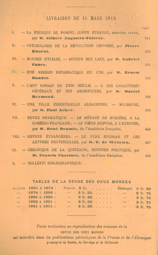 R48          Revue des Deux Mondes [Текст]. – 1912. – T. 8 (15 mars). – P. 242-480. – На тит. арк. кн. знак: Militaerwissenschaftlicher und Kasino Verein in Lemberg B.