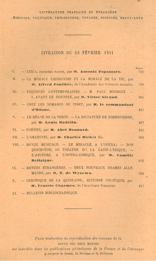 R48          Revue des Deux Mondes [Текст]. – 1911. – T. 1 (15 fevrier). – P. 721-960. – На тит. арк. кн. знаки: Бібліотека Кременецького Державного Учительського Інституту ; Militaerwissenschaftlicher und Kasino Verein in Lemberg B.