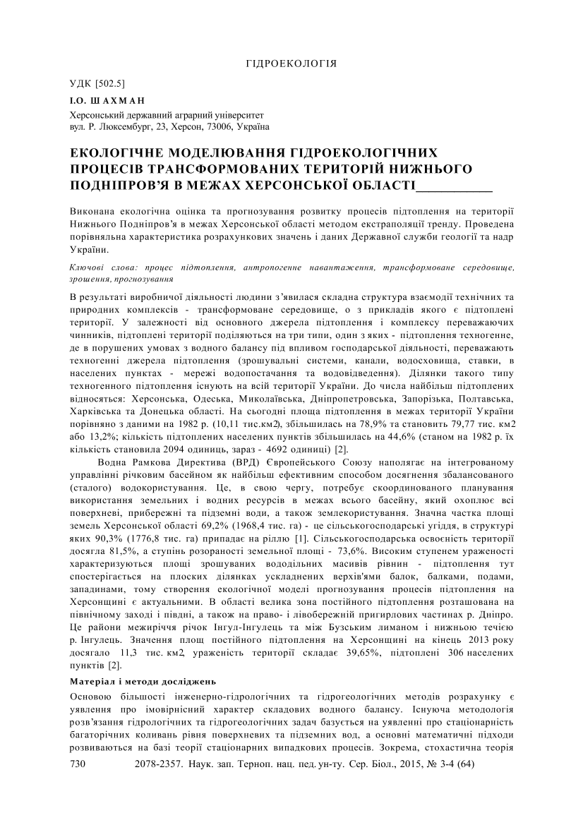 Шахман, О. Екологічне моделювання гідроекологічних процесів трансформованих територій Нижнього Подніпров'я в межах Херсонської області [Текст] / О. Шахман // Наукові записки Тернопільського національного педагогічного університету імені Володимира Гнатюка. Сер. Біологія. – 2015. – Вип. 3/4 (64) : Спеціальний вип.: Гідроекологія. – С. 730–733. – Бібліогр. в кінці ст.