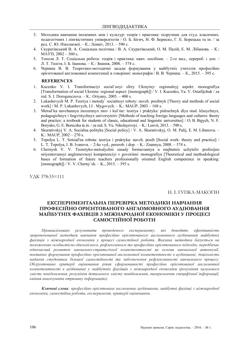 Експериментальна перевірка методики навчання професійно орієнтованого англомовного аудіювання майбутніх фахівців з міжнародної економіки у процесі самостійної роботи [Текст] / Н. І. Гупка-Макогін