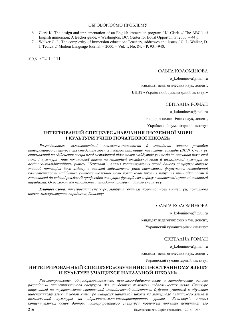 Коломінова, О. Інтегрований спецкурс "Навчання іноземної мови і культури учнів початкової школи" [Текст] / О. Коломінова, С. Роман // Історія України: сучасні виклики. – 2016. – С. 216–222.