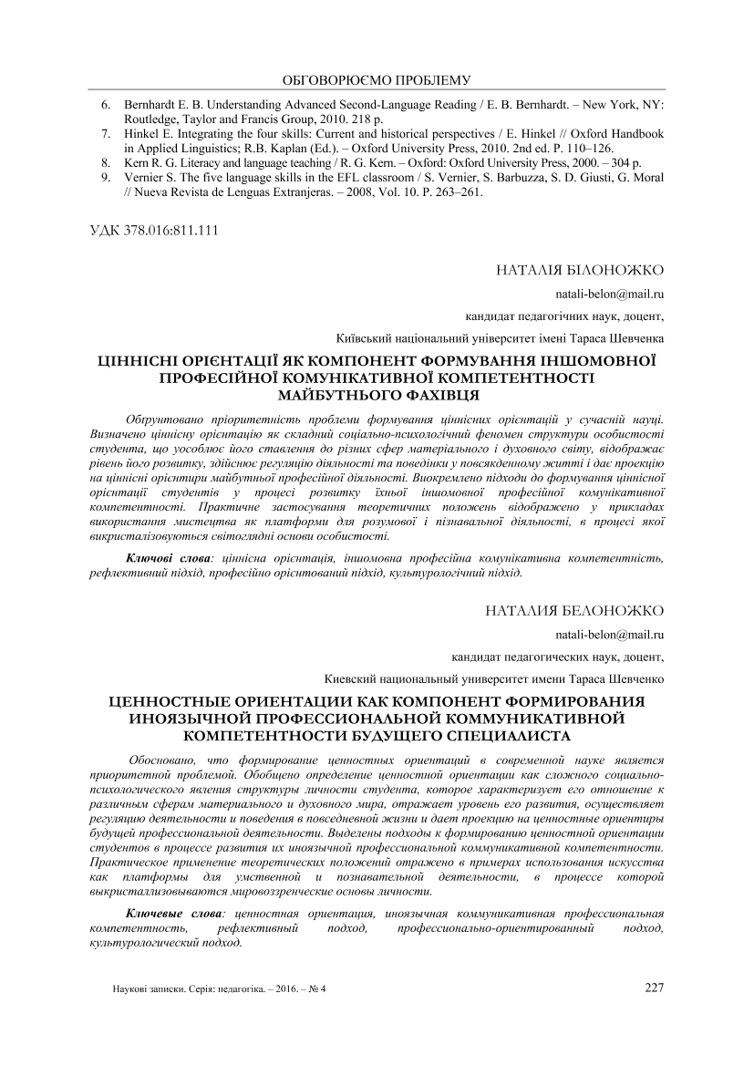 Білоножко, Н. Ціннісні орієнтації як компонент формування іншомовної професійної комунікативної компетентності майбутнього фахівця [Текст] / Н. Білоножко // Наукові записки Тернопільського національного педагогічного університету імені Володимира Гнатюка. Сер. Педагогіка. – 2016. – № 4. – С. 227–233. – Бібліогр. в кінці ст.