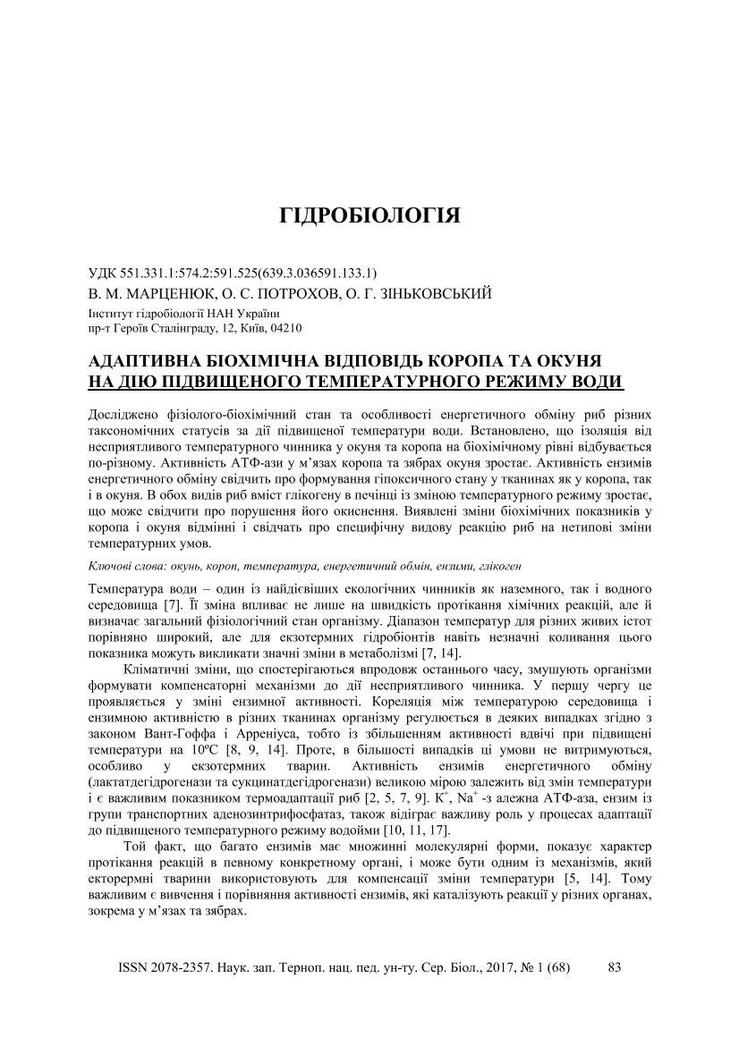 Адаптивна біохімічна відповідь коропа та окуня на дію підвищеного температурного режиму води [Текст] / В. М. Марценюк, О. С. Потрохов, О. Г. Зіньковський