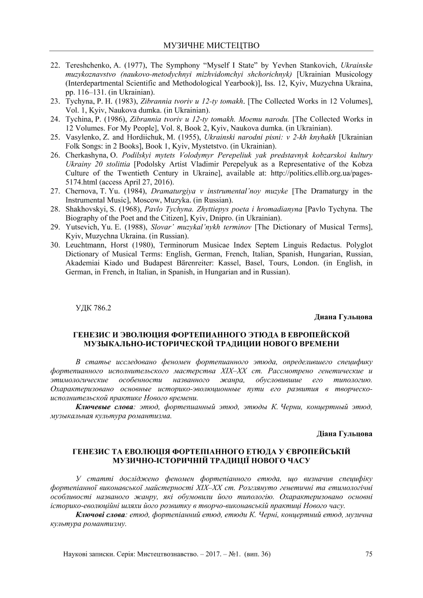 Гульцова, Д. Генезис и эволюция фортепианного этюда в европейской музыкально-исторической традиции нового времени [Текст] / Д. Гульцова // Наукові записки Тернопільського національного педагогічного університету імені Володимира Гнатюка. Сер. Мистецтвознавство. – 2017. – № 1 (Вип. 36). – С. 75–84. – Бібліогр. наприкінці ст.