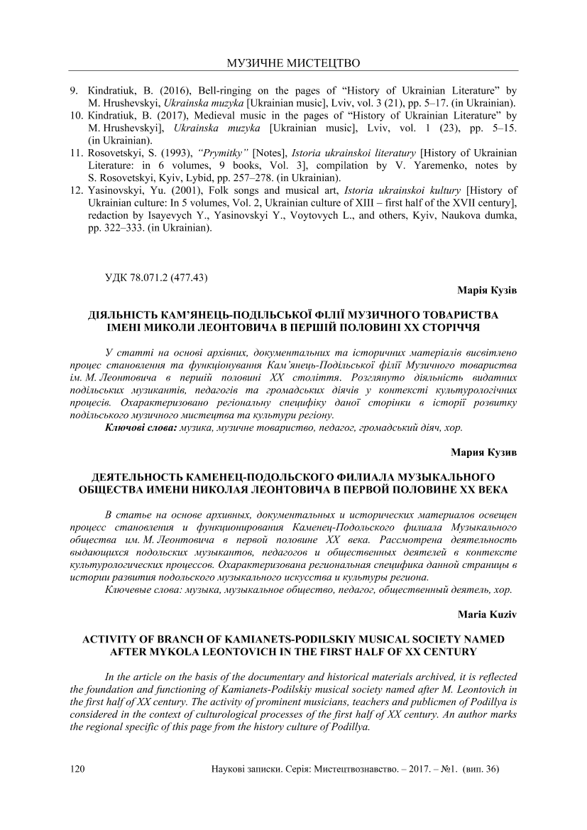 Кузів, М. Діяльність Кам'янець-Подільської філії музичного товариства імені Миколи Леонтовича у першій половині ХХ сторіччя [Текст] / М. Кузів // Наукові записки Тернопільського національного педагогічного університету імені Володимира Гнатюка. Сер. Мистецтвознавство. – 2017. – № 1 (Вип. 36). – С. 120–126. – Бібліогр. наприкінці ст.