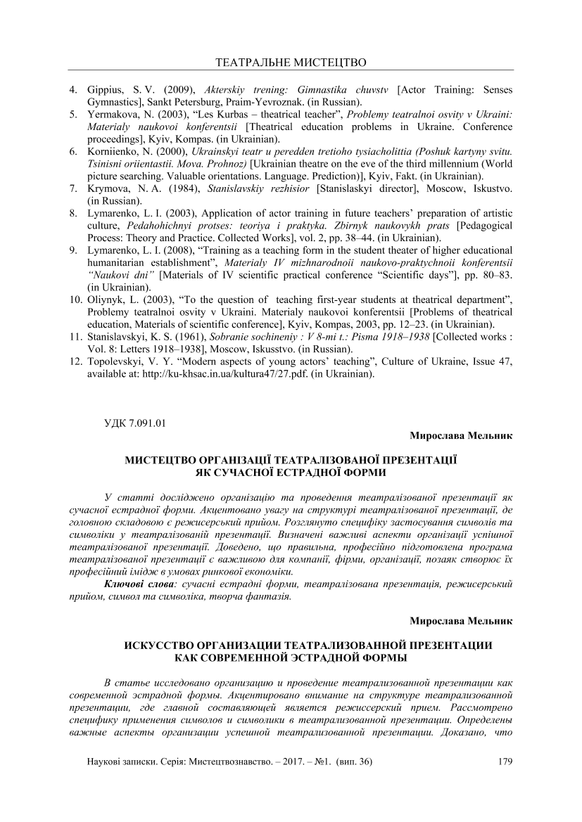 Мельник, М. Мистецтво організації театралізованої презентації як сучасної естрадної форми [Текст] / М. Мельник // Наукові записки Тернопільського національного педагогічного університету імені Володимира Гнатюка. Сер. Мистецтвознавство. – 2017. – № 1 (Вип. 36). – С. 179–184. – Бібліогр. наприкінці ст.