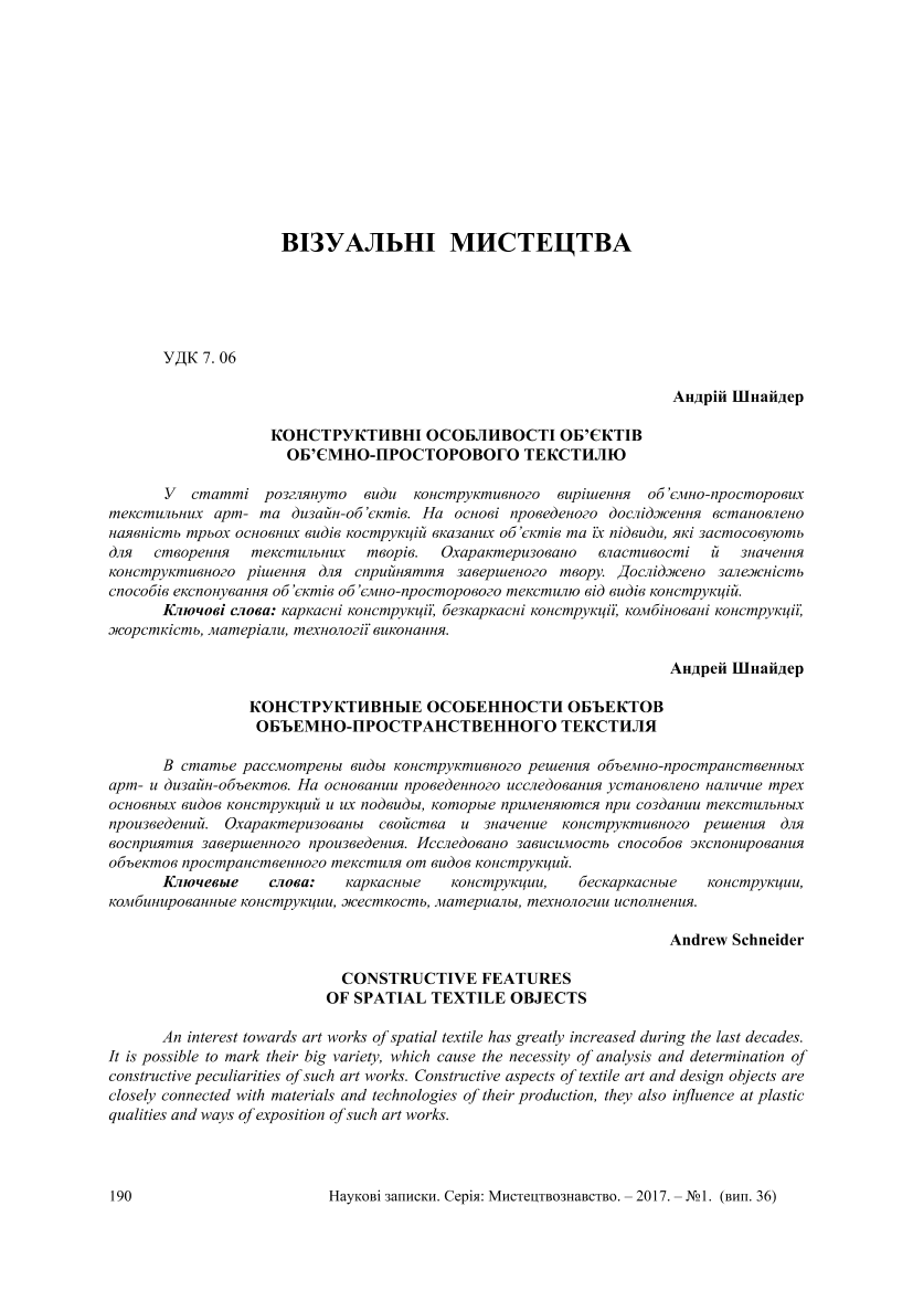Шнайдер, А. Конструктивні особливості об'єктів об'ємно-просторового текстилю [Текст] / А. Шнайдер // Наукові записки Тернопільського національного педагогічного університету імені Володимира Гнатюка. Сер. Мистецтвознавство. – 2017. – № 1 (Вип. 36). – С. 190–197. – Бібліогр. наприкінці ст.