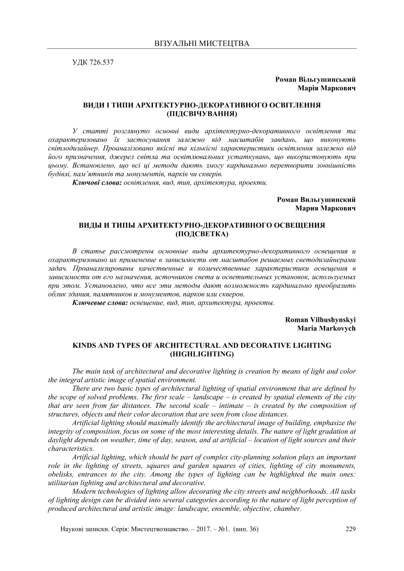 Вільгушинський, Р. Види і типи архітектурно-декоративного освітлення (підсвічування) [Текст] / Р. Вільгушинський, М. Маркович // Наукові записки Тернопільського національного педагогічного університету імені Володимира Гнатюка. Сер. Мистецтвознавство. – 2017. – № 1 (Вип. 36). – С. 229–234. – Бібліогр. наприкінці ст.