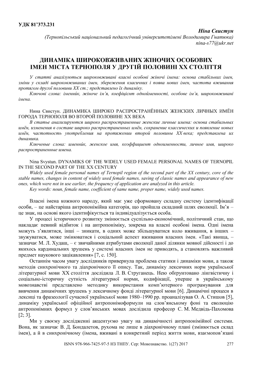 Свистун, Н. Динаміка широковживаних жіночих особових імен міста Тернополя у другій половині ХХ століття [Текст] / Н. Свистун // Наукові записки Тернопільського національного педагогічного університету імені Володимира Гнатюка. Сер. Мовознавство. – 2017. – Вип. 1(27). – С. 277–280. – Бібліогр. в кінці ст.