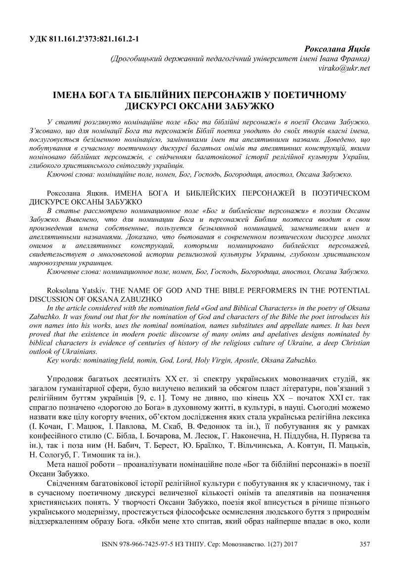 Яцків, Р. Імена Бога та біблійних персонажів у поетичному дискурсі Оксани Забужко [Текст] / Р. Яцків // Наукові записки Тернопільського національного педагогічного університету імені Володимира Гнатюка. Сер. Мовознавство. – 2017. – Вип. 1(27). – С. 357–361. – Бібліогр. в кінці ст.