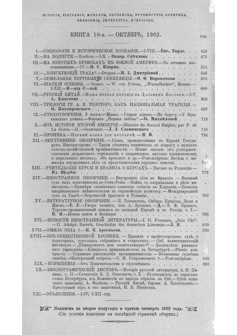 [Текст] : журналъ исторіи-политики- литературы. Тридцать седьмой годъ. Т.5, кн. 10(октябрь) / издатель и редакторъ М. Стасюлевичъ. – Петербургъ : Типографія М. М. Стасюлевича, 1902. – С. 429-860.