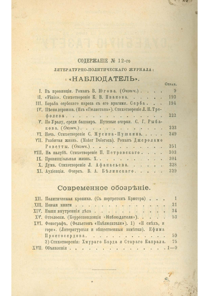Н13          Наблюдатель [Текст] : журналъ литературный, политическій и ученый. Годъ восемнадцатый. №12 (декабрь) / подъ редакціей А. П. Пятковскаго. – С.-Петербург : Типографія Главнаго Управленія Уделовъ, 1899. – 344, 74 с.