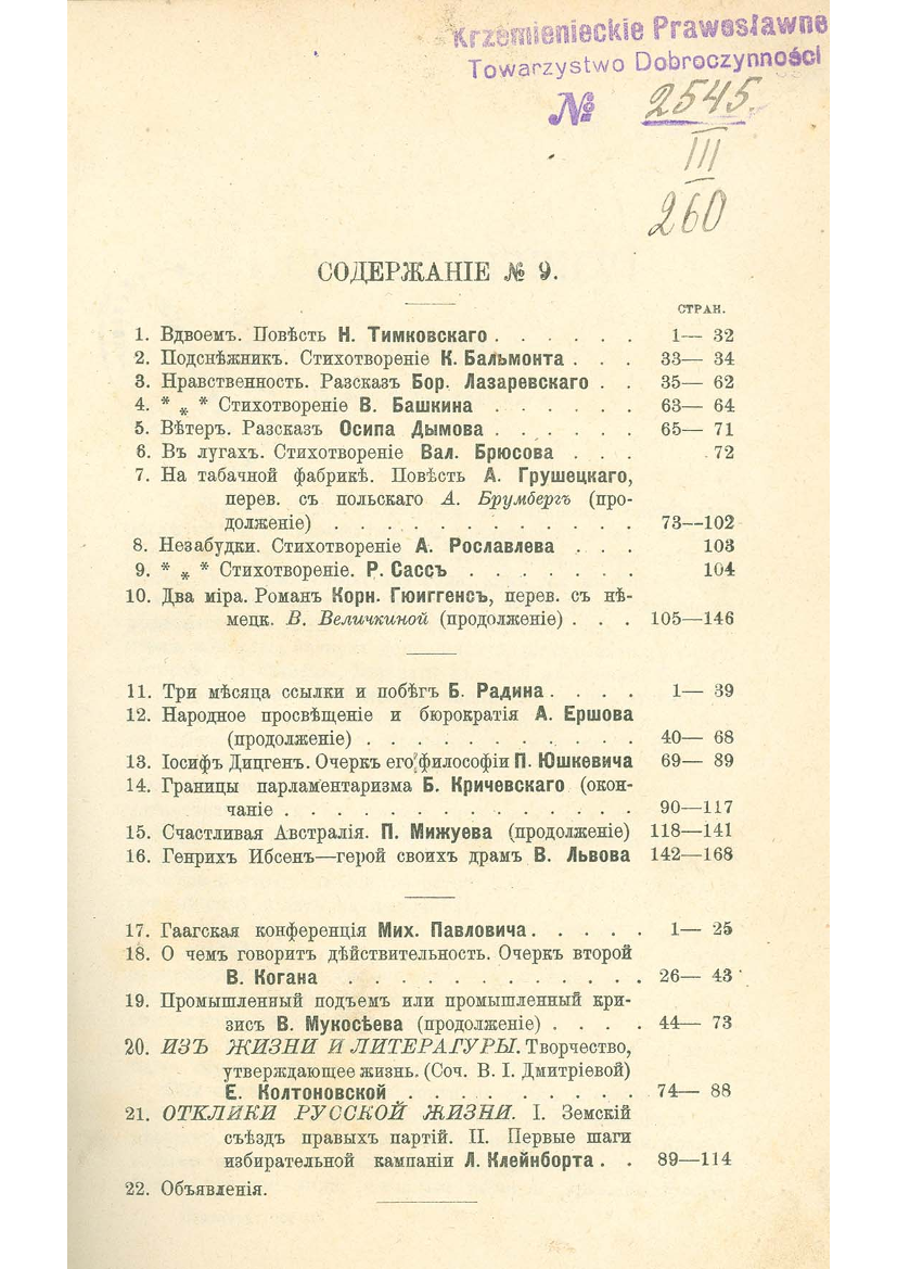 [Текст] : литературный и общественно-политическій журналъ. № 9 / редакторъ-издатель А. Я. Острогорскій. – С.-Петербургъ : Типо-литографія Б. М. Вольфа, 1907.