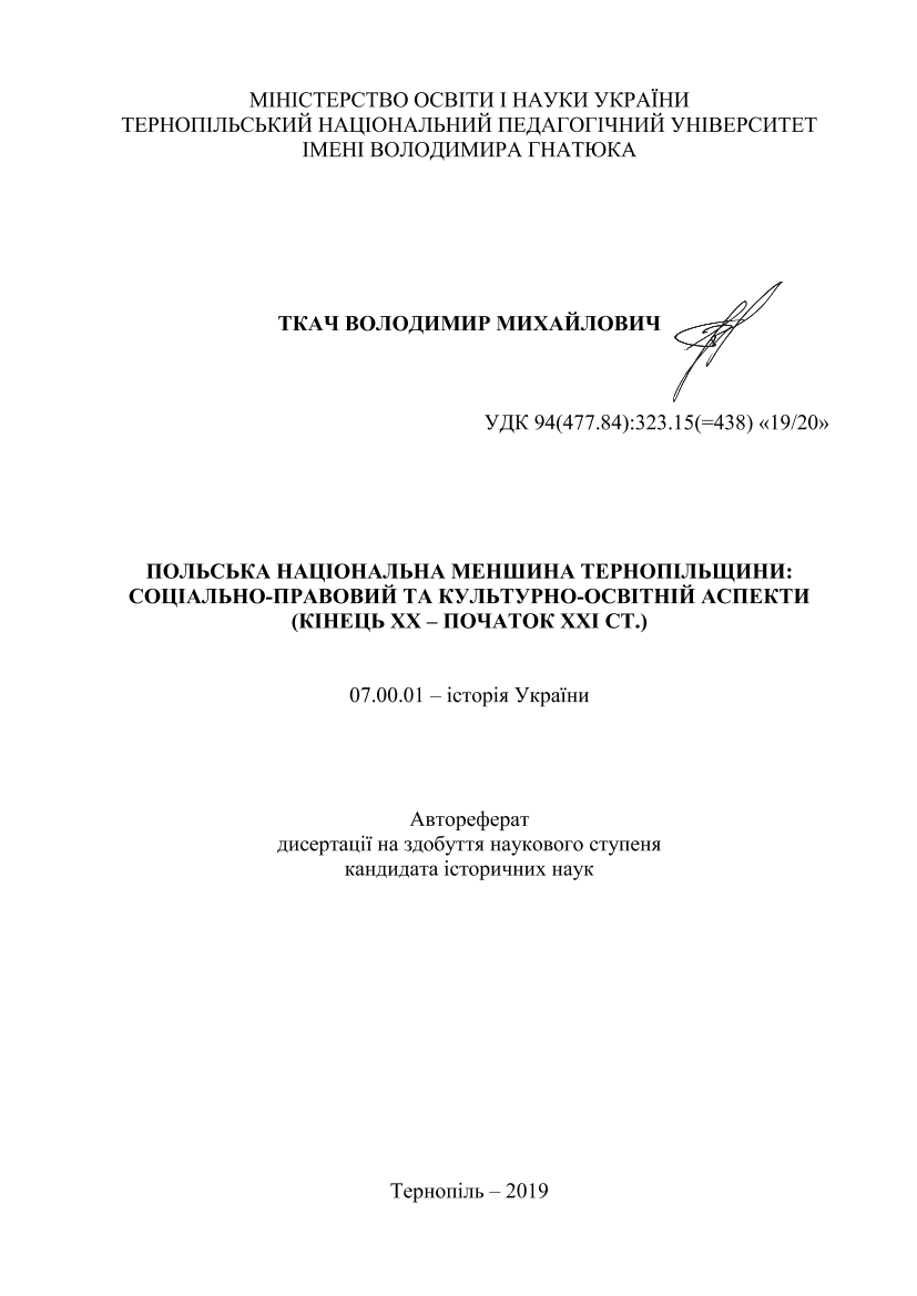 Ткач, В. М. Польська національна меншина Тернопільщини: соціально-правовий та культурно-освітній аспекти (кінець XX - початок XXI ст.) [Текст] : автореф. дис. на здоб. наук. ступ. канд. іст. наук : 07.00.01 - історія України / Ткач Володимир Михайлович ; Тернопільський нац. пед. ун-т ім. В. Гнатюка. – Тернопіль, 2019. – 20 с.