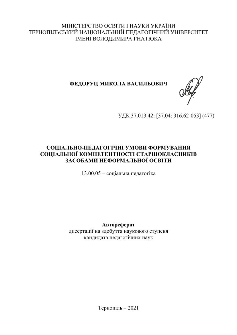 Соціально-педагогічні умови формування соціальної компетентності старшокласників засобами неформальної освіти [Текст] : автореф. дис. на здоб. наук. ступ. канд. пед. наук : 13.00.05 - соціальна педагогіка / Федоруц Микола Васильович ; Тернопільський нац. пед. ун-т ім. В. Гнатюка. – Тернопіль, 2021. – 19 с.