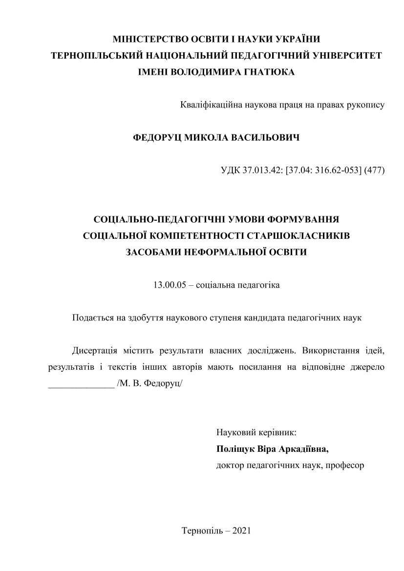 Федоруц, М. В. Соціально-педагогічні умови формування соціальної компетентності старшокласників засобами неформальної освіти [Текст] : дис. ... канд. пед. наук : 13.00.05 - соціальна педагогіка / Федоруц Микола Васильович ; Тернопільський нац. пед. ун-т ім. В. Гнатюка ; наук. кер. В. А. Поліщук. – Тернопіль, 2021. – 370 с. – Бібліогр.: с. 215-248.