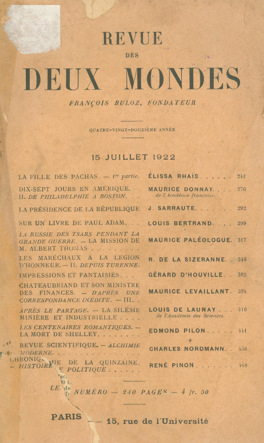R48          Revue des Deux Mondes [Текст]. – 1922. – T. 10 (15 juillet). – P. 241-480. – На тит. арк. кн. знак: Бібліотека Кременецького Державного Учительського Інституту.