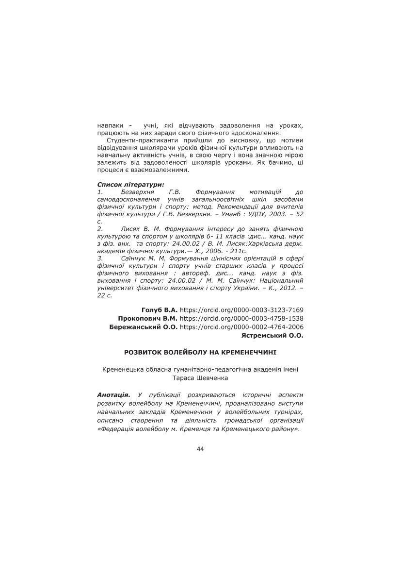 Розвиток волейболу на Кременеччині [Текст] / В. А. Голуб, В. М. Прокопович, О. О. Бережанський, О. О. Ястремський // Інноваційні підходи до фізичного виховання і спорту студентської молоді : матеріали п'ятого регіонального науково-методичного семінару, приуроч. 30 річниці створення Національного олімпійського комітету України / за заг. ред. А. В. Огнистого ; ТНПУ, Федерація бадмінтону України. – Тернопіль : [ТАЙП], 2020. – С. 44–49. – Бібліогр. наприкінці ст.
