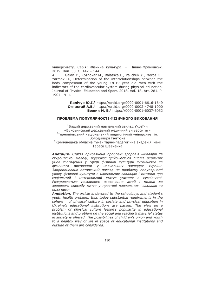 Палічук, Ю. І. Проблема популярності фізичного виховання [Текст] / Ю. І. Палічук, А. В. Огнистий, М. В. Божик // Інноваційні підходи до фізичного виховання і спорту студентської молоді : матеріали п'ятого регіонального науково-методичного семінару, приуроч. 30 річниці створення Національного олімпійського комітету України / за заг. ред. А. В. Огнистого ; ТНПУ, Федерація бадмінтону України. – Тернопіль : [ТАЙП], 2020. – С. 130–133. – Бібліогр. наприкінці ст.