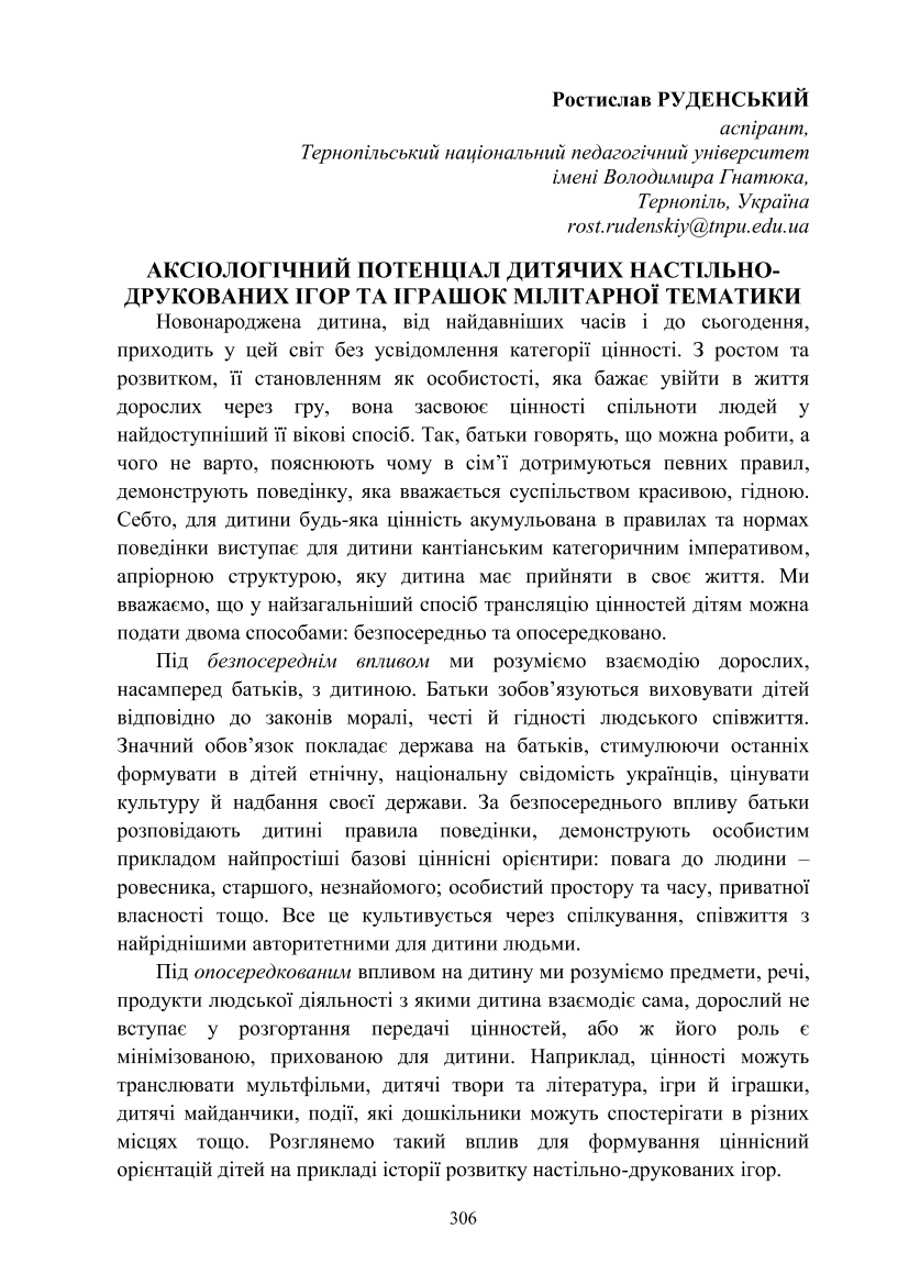 Руденський, Р. Аксіологічний потенціал дитячих настільно-друкованих ігор та іграшок мілітарної тематики [Текст] / Р. Руденський // Ціннісні орієнтири в сучасному світі: теоретичний аналіз та практичний досвід : Міжнародна науково-практична конференція, Тернопіль, 13-14 трав. 2022 р. : збірник тез / редкол.: Н. Л. Морська, Л. М. Литвин, Г. А. Поперечна. – Тернопіль : ТНПУ ім. В. Гнатюка, 2022. – С. 306–309. – Бібліогр. наприкінці ст.