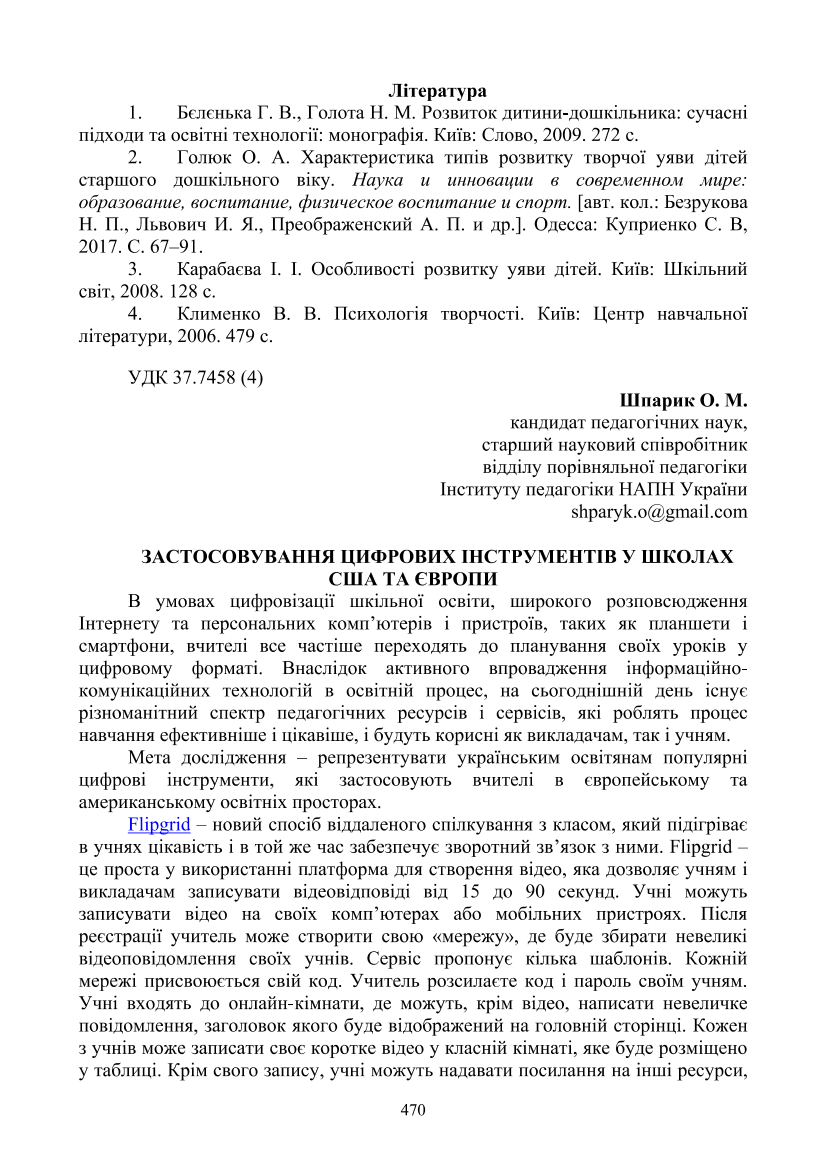 Шпарик, О. М. Застосовування цифрових інструментів у школах США та Європи [Текст] / О. М. Шпарик // Розвиток професійної майстерності педагога в умовах нової соціокультурної реальності : збірник матеріалів IV Міжнародної науково-практичної конференції, м. Тернопіль, 15-16 квітня 2021 року / редкол.: О. М. Петровський, І. М. Вітенко, О. І. Когут [та ін.]. – Тернопіль : Тайп, 2021. – С. 470–472. – Бібліогр. наприкінці ст.