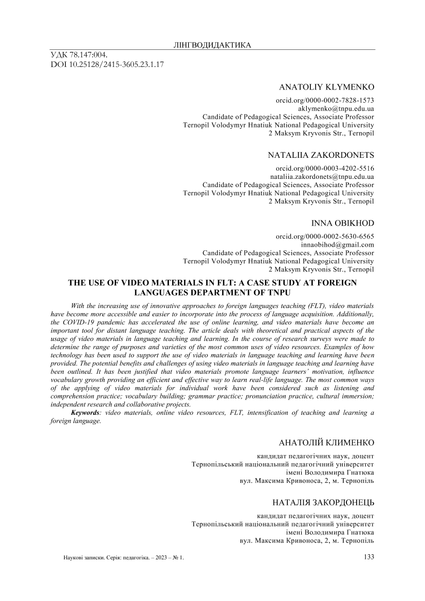 Klymenko, A. The use of video materials in flt: a case study at foreign languages department of TNPU [Текст] = Відеоматеріали у викладанні іноземних мов: досвід викладачів факультету іноземних мов ТНПУ / A. Klymenko, N. Zakordonets, I. Obikhod // Наукові записки Тернопільського національного педагогічного університету імені Володимира Гнатюка. Сер. Педагогіка. – 2023. – № 1. – P. 133–140. – Бібліогр. наприкінці ст.
