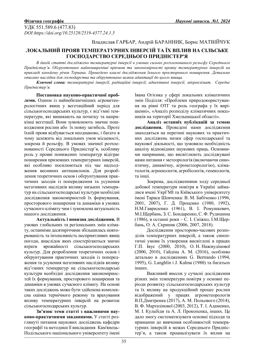 Гарбар, В. Локальний прояв температурних інверсій та їх вплив на сільське господарство Середнього Придністер'я [Текст] / В. Гарбар, А. Баранник, Б. Матвійчук // Наукові записки Тернопільського національного педагогічного університету ім. В. Гнатюка. Сер. Географія. – 2024. – Вип. 1 (56). – С. 35–42. – Бібліогр. наприкінці ст.